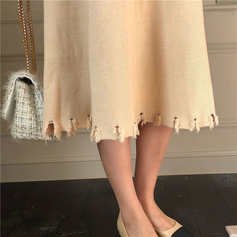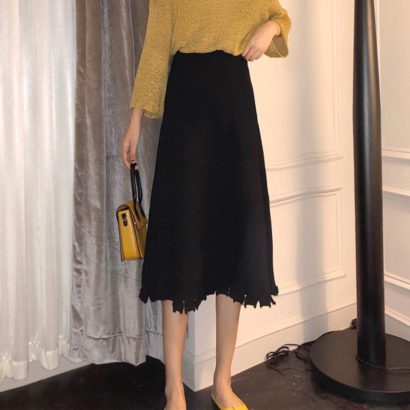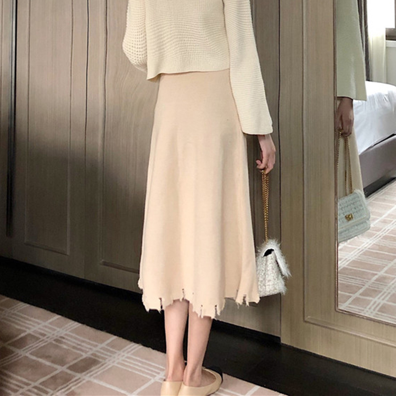 / 復古風破洞針織半身裙女秋裝新款高腰顯瘦中長裙休閑寬松A字裙子