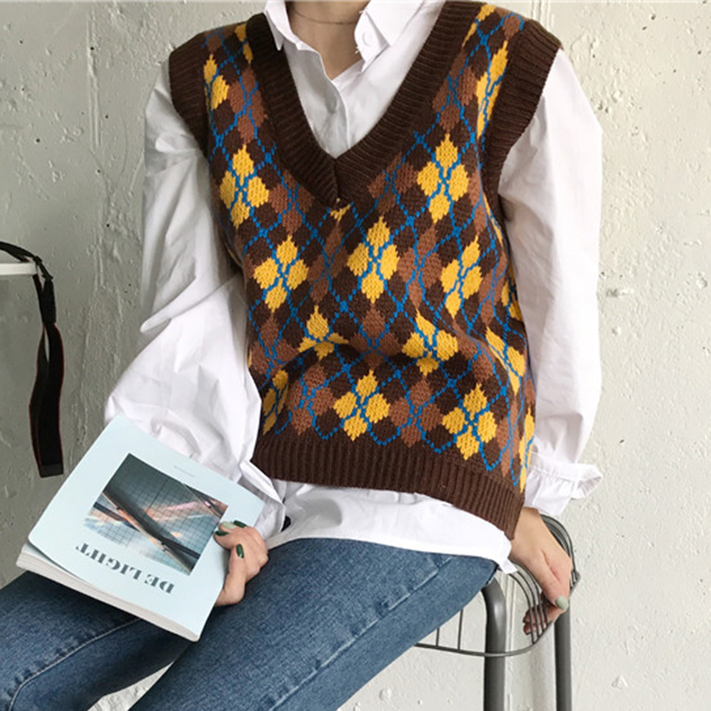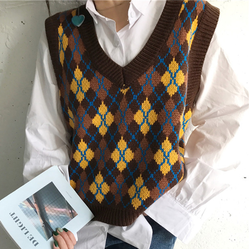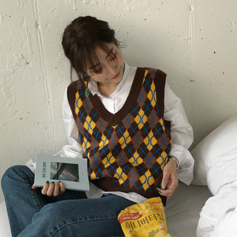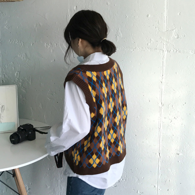 / 學生拼色提花針織背心馬甲秋裝女2018新款復古風短款V領毛衣上衣